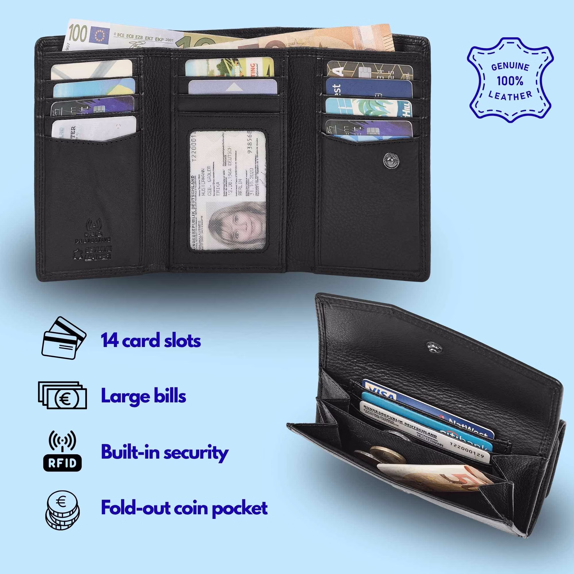 - AMPIO SPAZIO: Perfetto per 14 carte | Scomparti per carte e banconote di grandi dimensioni | Scomparti separati per banconote e monete | Questo portafoglio donna vera pelle garantisce che tutto sia ordinato e sicuro