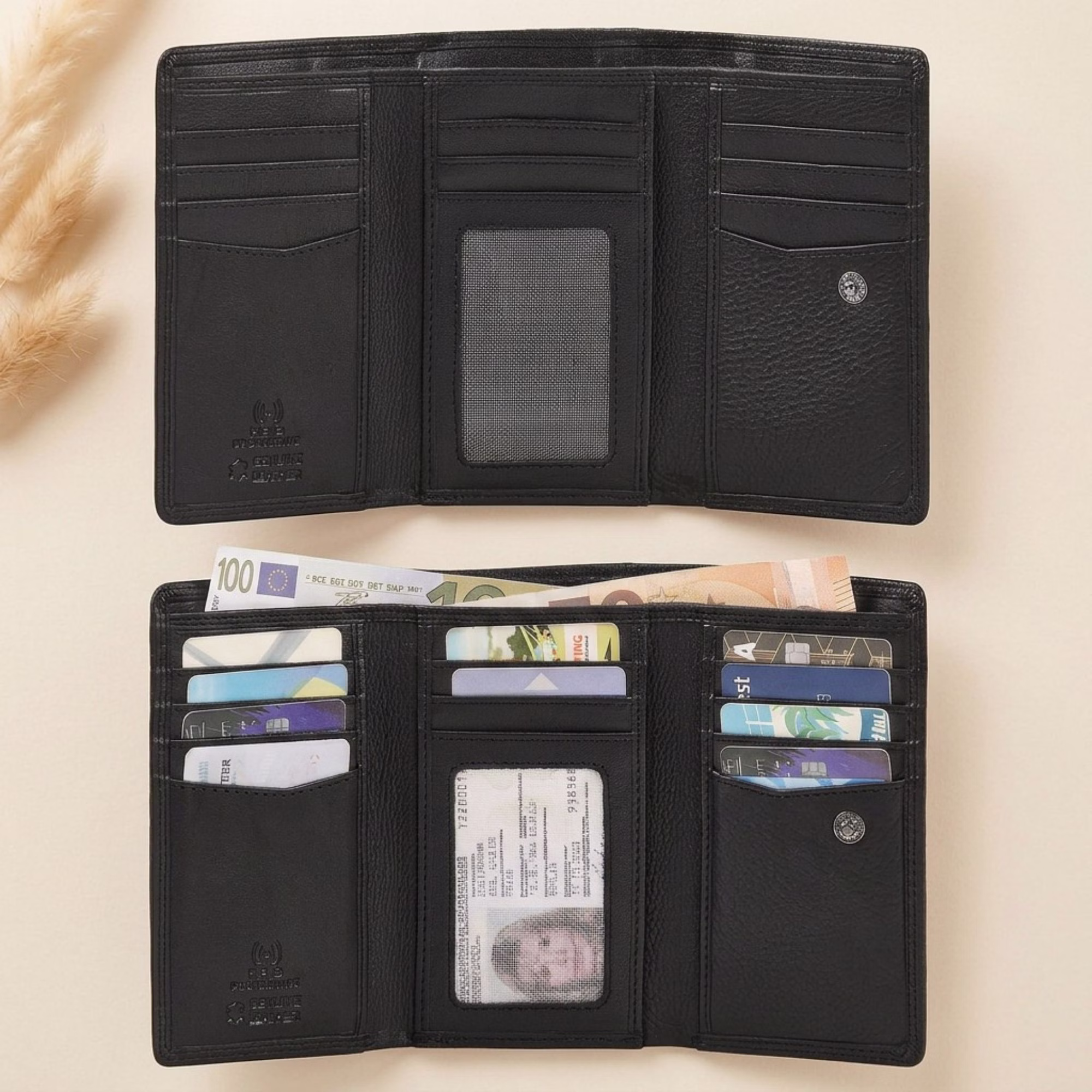 • Ampio spazio di archiviazione: 14 x scomparti per carte | 3 x tasche aggiuntive per carte o appunti | 2 x ampi scomparti per banconote e ricevute | 1 x scomparto per monete con doppio bottone | borsellini donna pelle