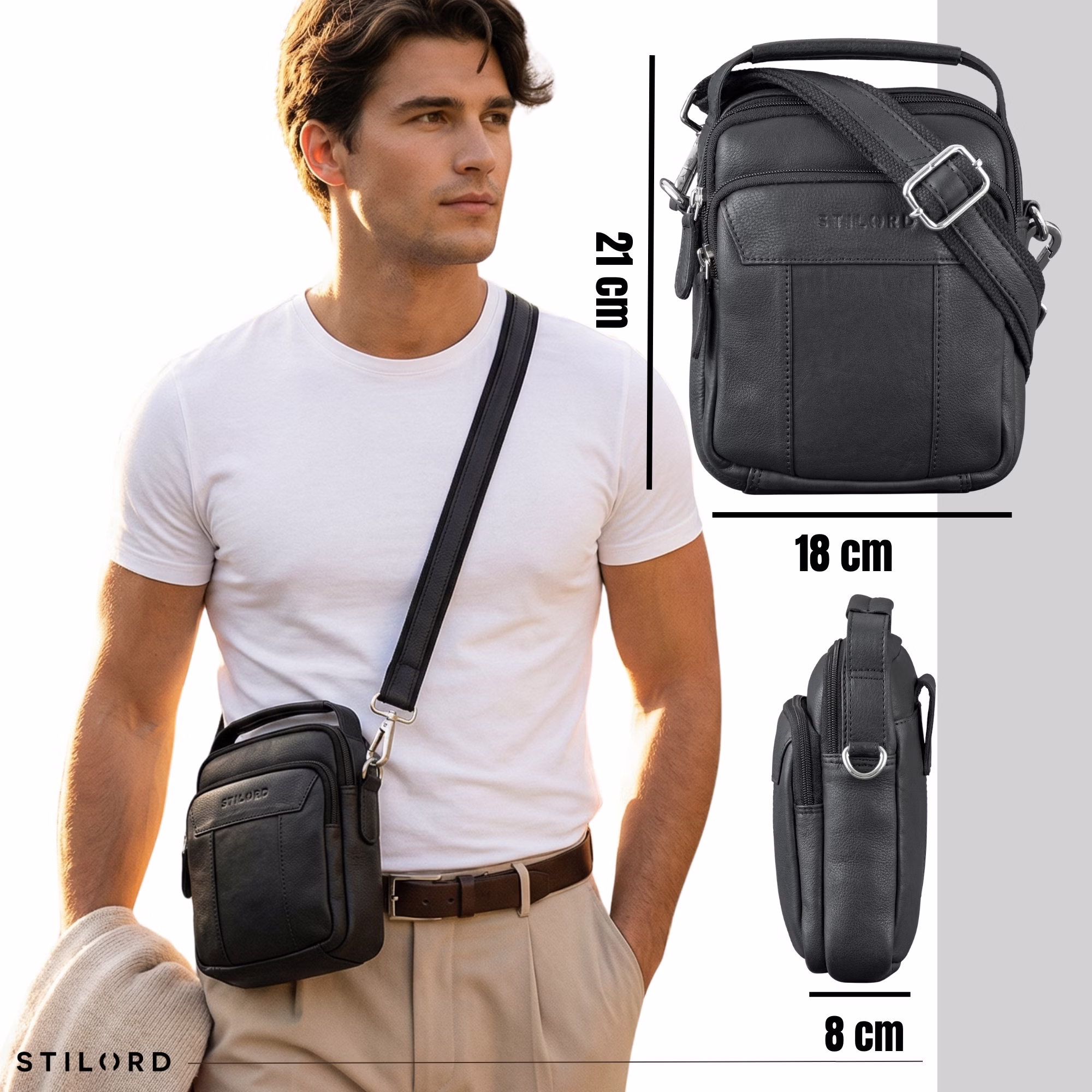 - TUTTI I DETTAGLI A COLPO D'OCCHIO: Dimensioni LxlxH: ca. 18 x 8 x 21 cm | Peso: 450 g | Modello: "Nomad" | Materiale: Vera Pelle | Produttore: STILORD | Chiusura: Cerniera | Scomparti: 1x scomparto principale con 1x tasca interna e 1x tasca con cerniera | 1x tasca frontale con cerniera | 1x passante cintura sul retro | 1x manico superiore | Tracolla removibile e regolabile: 68–150 cm | Larghezza tracolla: 3 cm