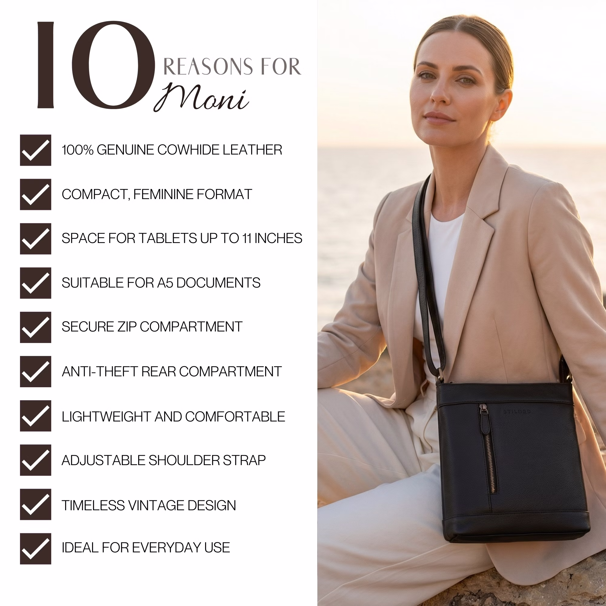 - DETTAGLI: Dimensioni: 24 x 6 x 26 cm | Peso: 370 g | Materiale: vera pelle bovina | Modello: "Moni" | Compatibilità: tablet 10,9 | 11 pollici, bottiglia da 0,5 L, documenti DIN A5 | Punti di forza: suddivisione intelligente degli scomparti, tasca posteriore antifurto, tracolla regolabile.