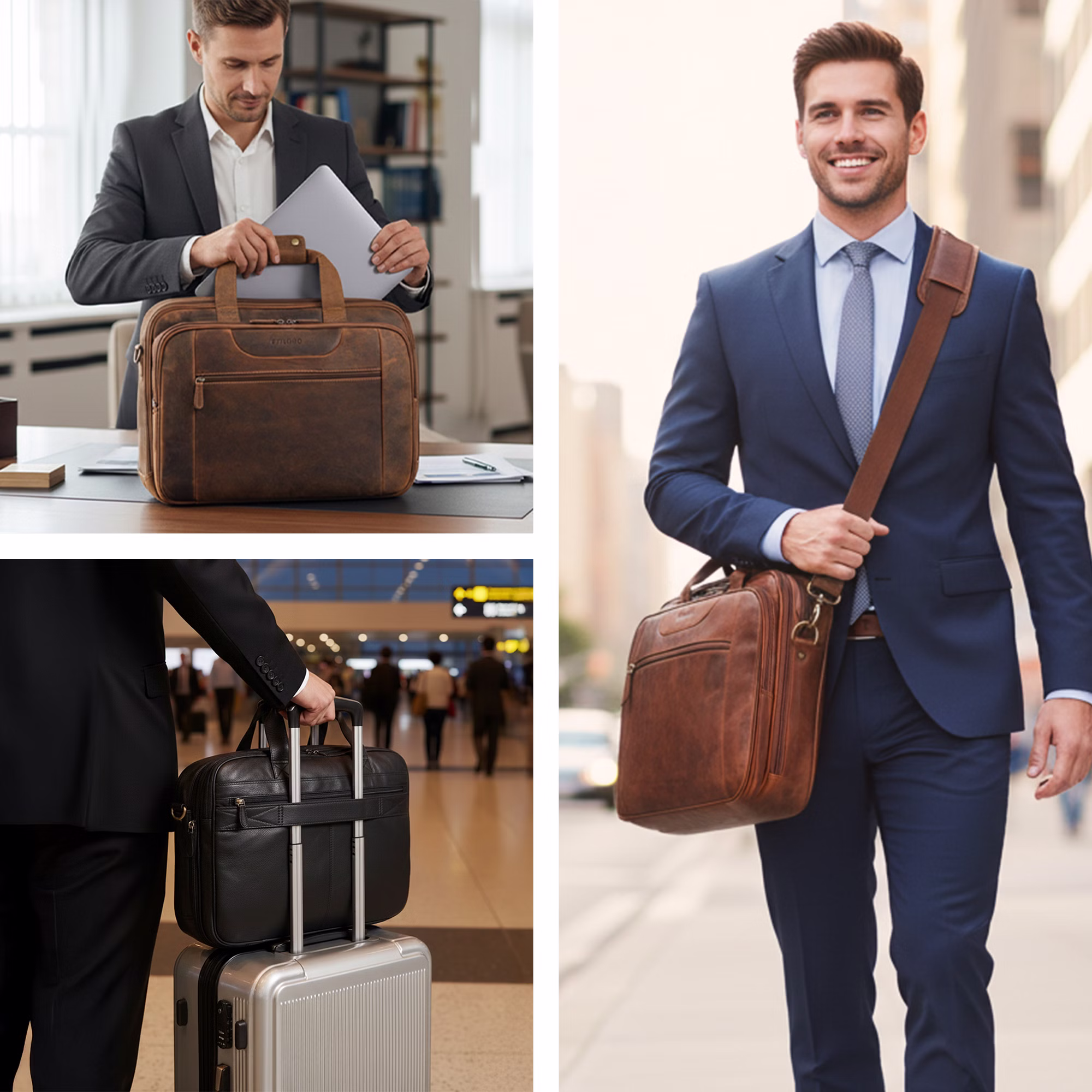 - FLESSIBILE & COMODA: Borsa portadocumenti uomo pelle con manico robusto, tracolla regolabile e rimovibile (75–135 cm) + cinghia trolley per i viaggi. Da portare come borsa a tracolla, messenger o cartella classica.