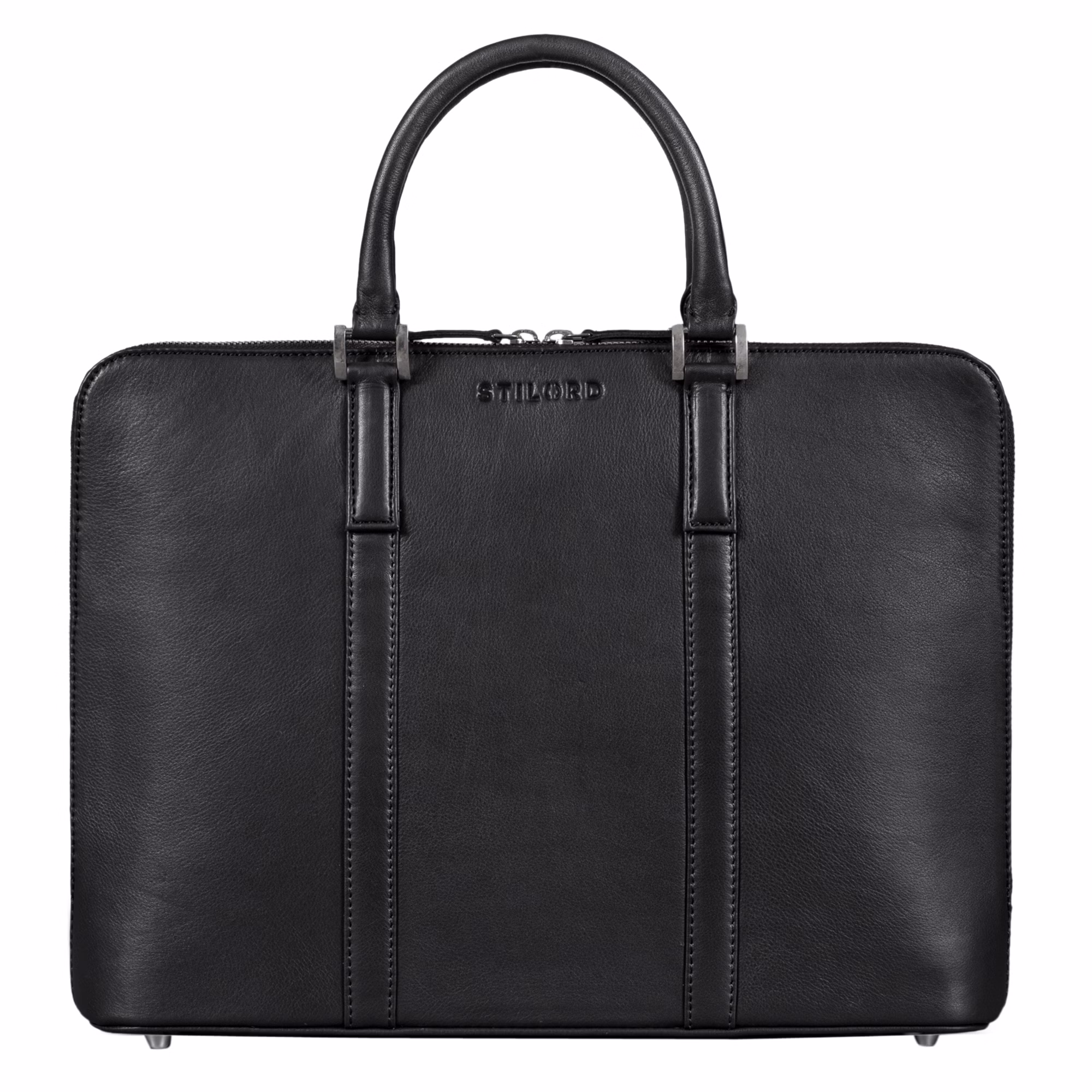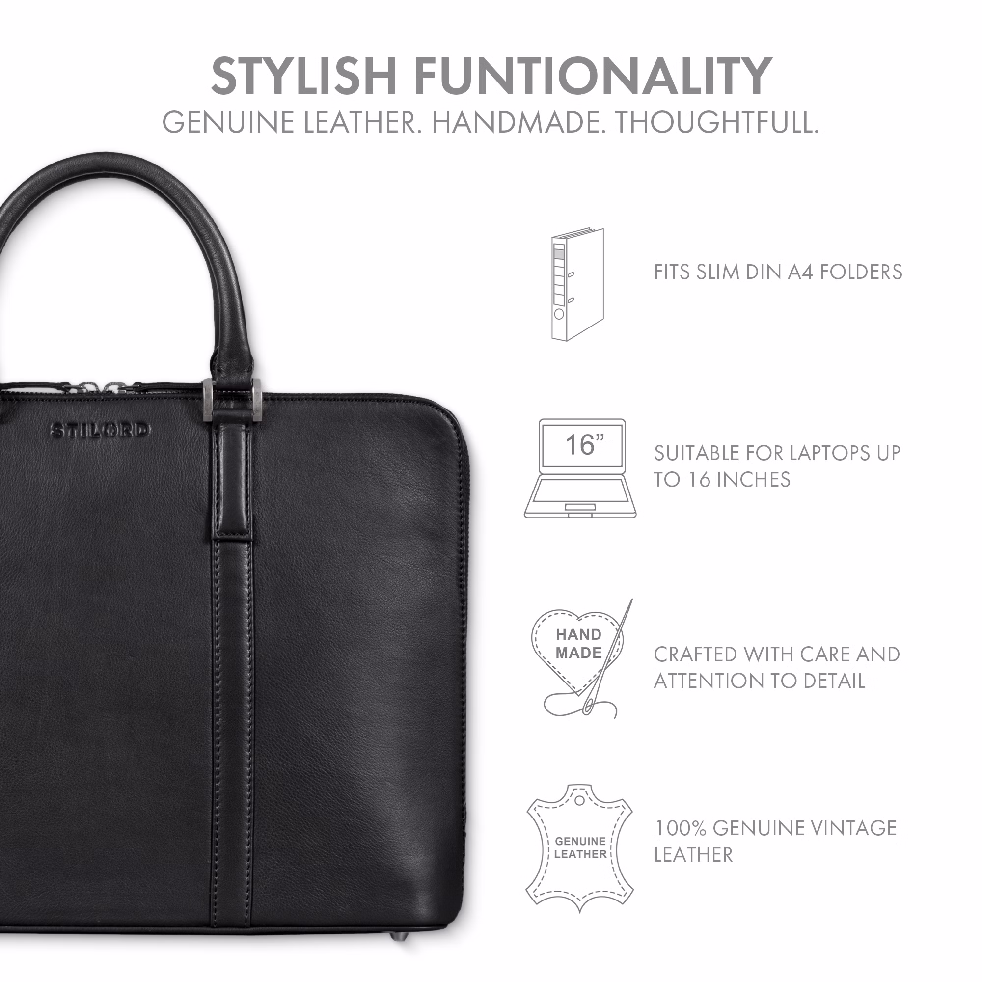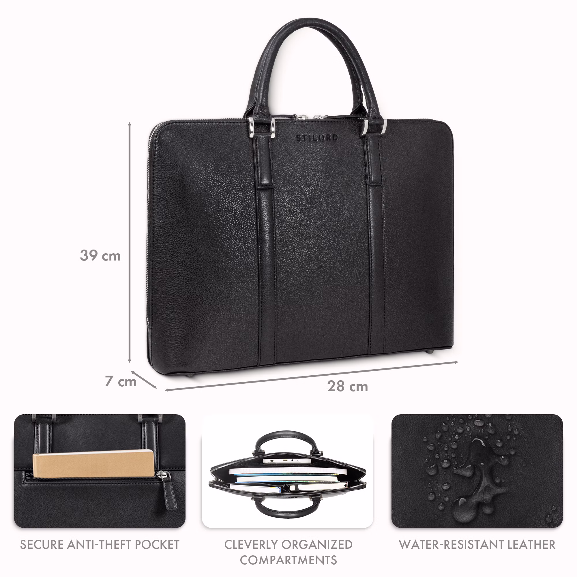 - DETTAGLI: Dimensioni: 39 x 7 x 28 cm | Peso: 750 g | Materiale: vera pelle bovina | Modello: "Leonora" | Marca: STILORD | Compatibilità: laptop fino a 16 pollici, raccoglitori sottili | Caratteristiche speciali: design sottile, piedini in metallo, tasca antifurto