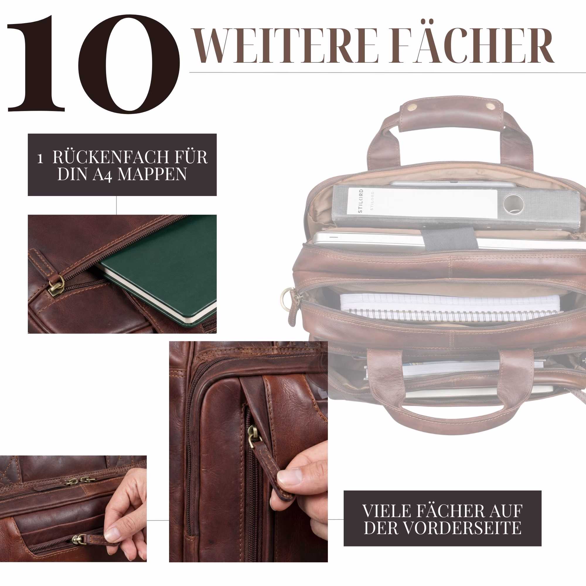 - SPAZIO XXL: Ampio interno per laptop da 17+ pollici, raccoglitori formato A4 e tutti i documenti essenziali – la borsa in pelle XXL perfetta per ufficio, università e scuola.