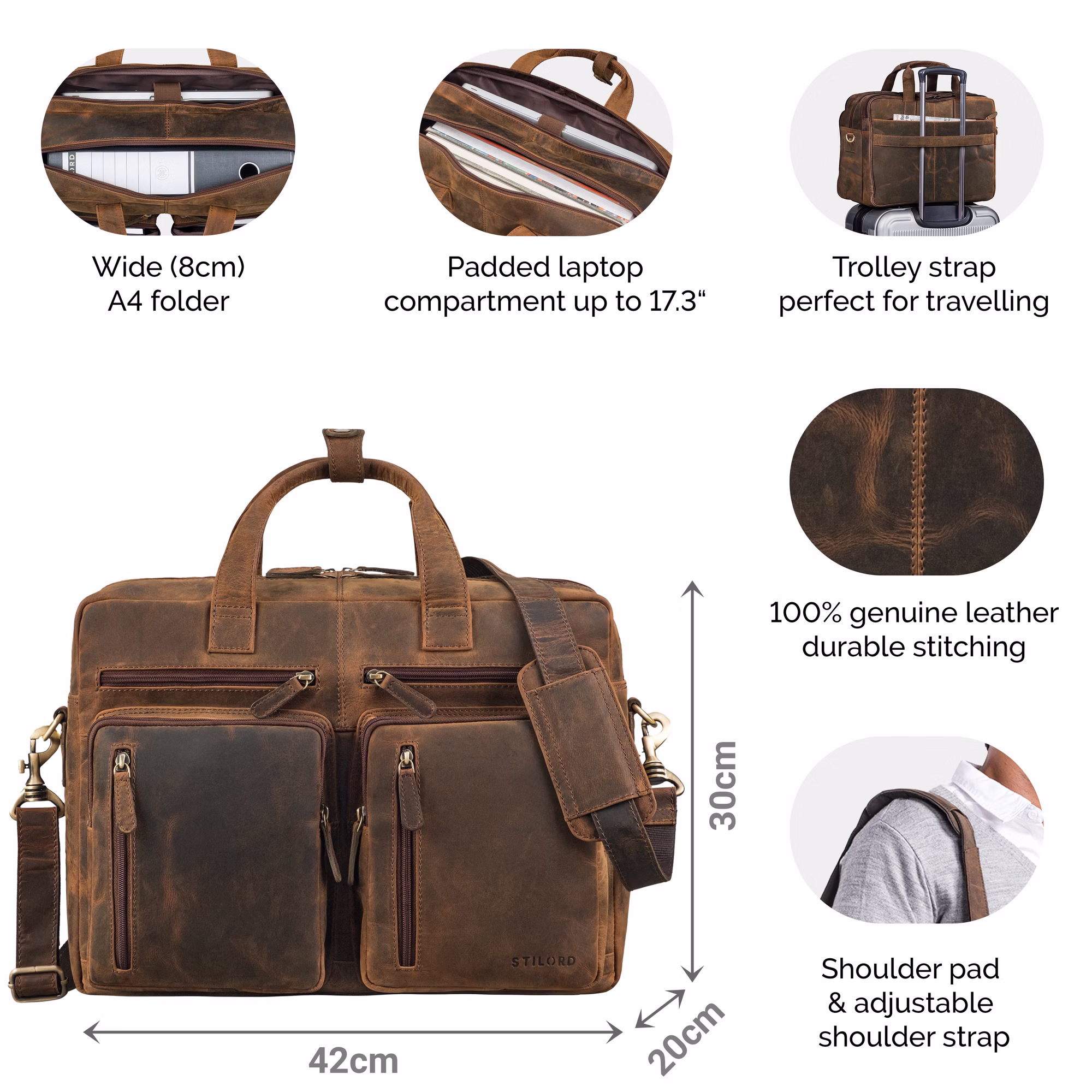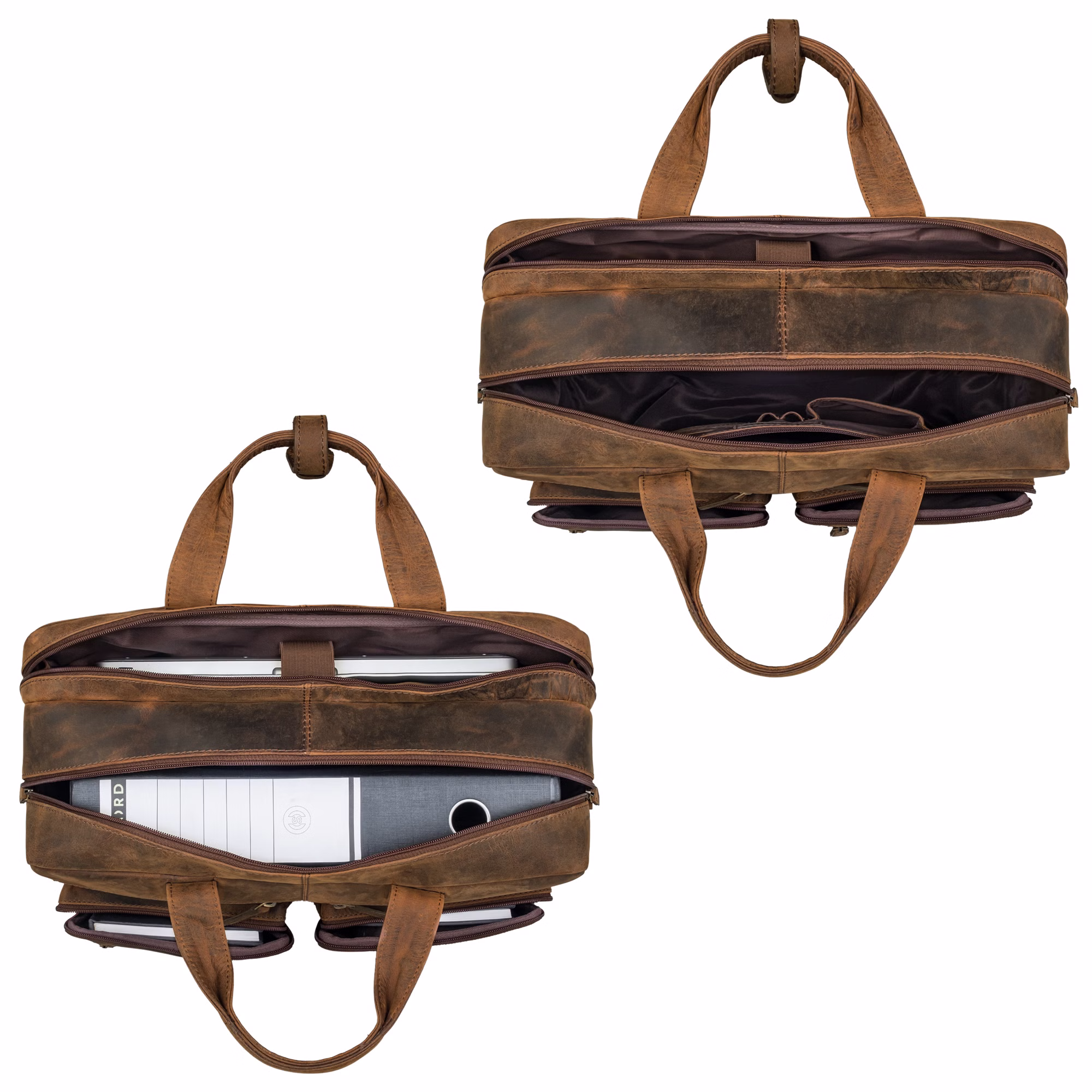 - Dimensioni: (LxLxA): circa 42 x 20 x 30 cm | Peso: 1420 grammi | Materiale: pelle bovina | Scomparto per laptop da 15 | 15,3 | 16 | 17 e 17,3 pollici e Macbook (max. 38 x 28 cm), cartelle A4 larghe
