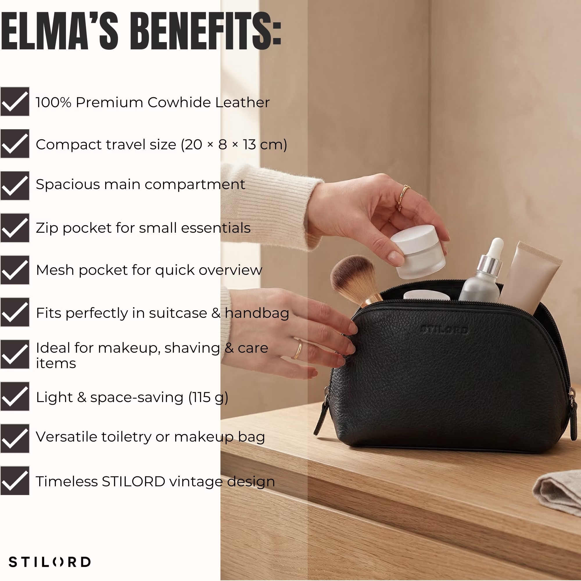 - VERA PELLE DI QUALITÀ: Questo beauty case in pelle convince per resistenza, grana naturale e stile senza tempo. “Elma” accompagna con eleganza viaggio, quotidianità e routine di cura personale.