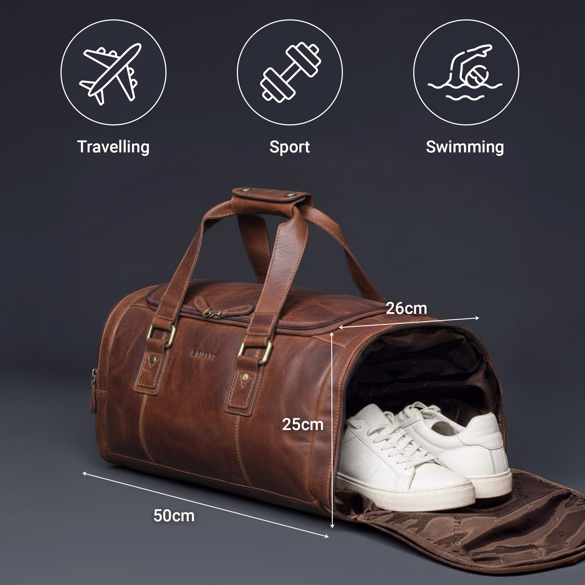 • SENZA TEMPO. ROBUSTO. SALVADOR: Il borsa da weekend con scomparto per scarpe offre 30 litri, formato 50 x 24 x 25 cm e vera pelle vintage dal carattere deciso. Per lavoro, weekend o sport, questa borsa da palestra ti accompagna con stile, comfort e lunga durata.