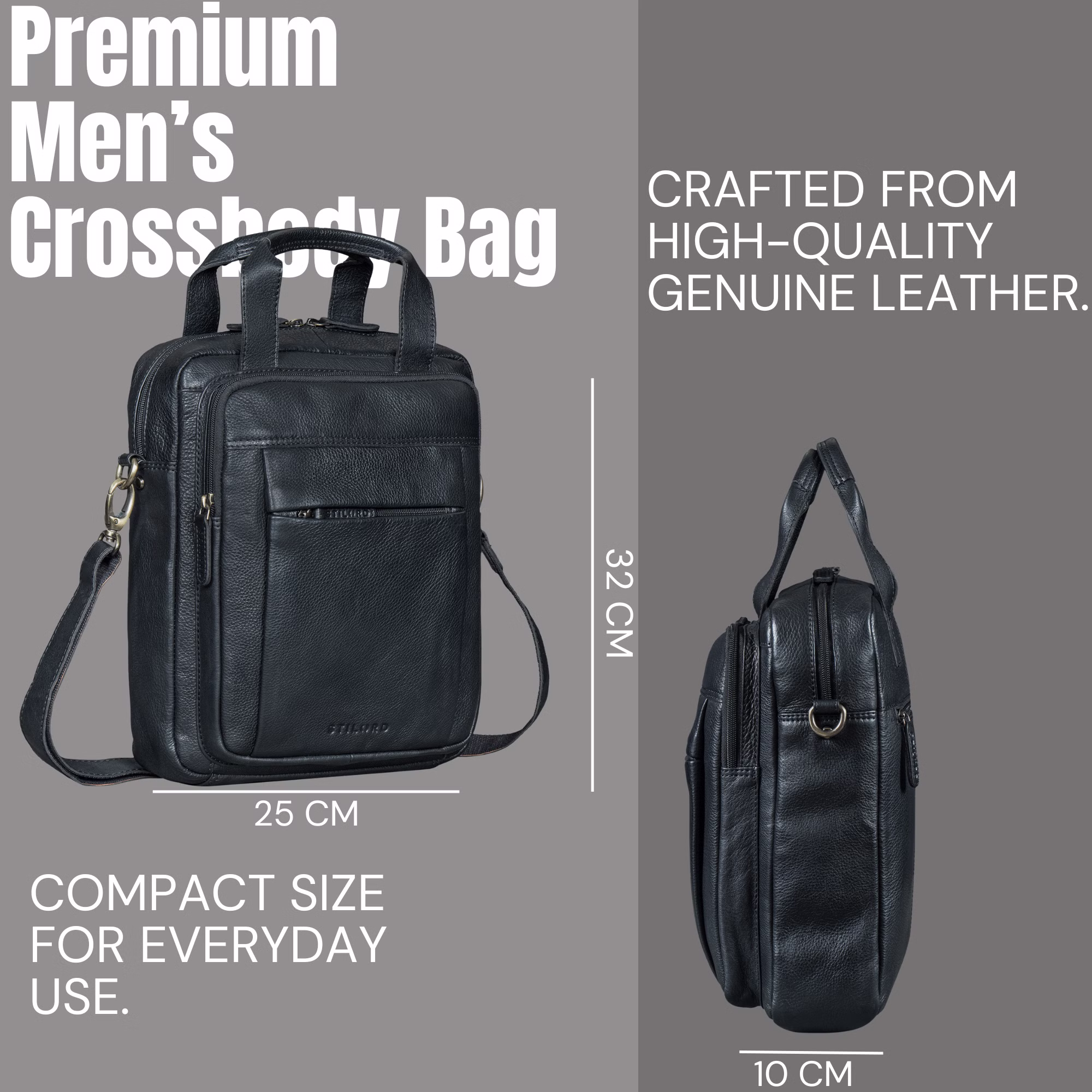 • Formato compatto e funzionale: con 25 × 10 × 32 cm, il borsello uomo pelle vera offre spazio per documenti A4, una bottiglia da 1 litro e tutti gli accessori quotidiani – sempre ben organizzati e facilmente accessibili.