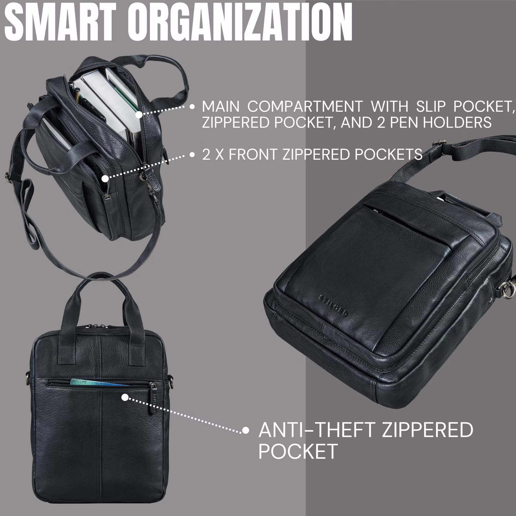 • SICUREZZA E ORDINE: Tasche frontali con zip e comparto antifurto posteriore. Perfetto come borsa messenger uomo pelle vintage o borsello da viaggio uomo elegante.