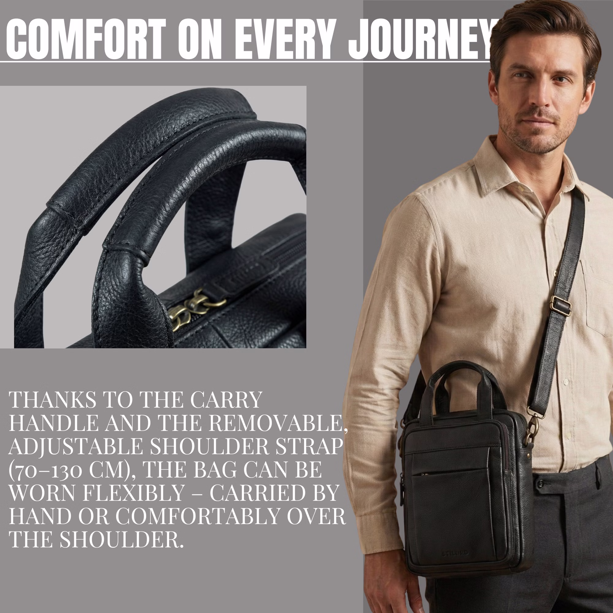 • Comodità e adattabilità: manico superiore e tracolla regolabile (70–130 cm) garantiscono flessibilità e comfort. Perfetta come borsa uomo tracolla pelle vintage o borsa messenger.