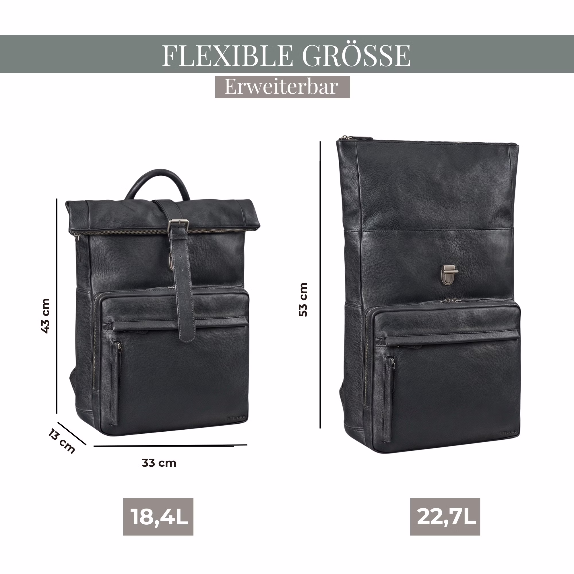 • DETTAGLI: Dimensioni: ca. 40 x 14 x 45 cm | Peso: 1300 g | Modello: "Melvin" | Materiale: Pelle di bovino vera | Marca: STILORD | Compatibilità: Laptop 15.6, 16, 17 pollici | Caratteristiche speciali: Scomparto per notebook, spallacci imbottiti, design Rolltop espandibile, supporto per trolley