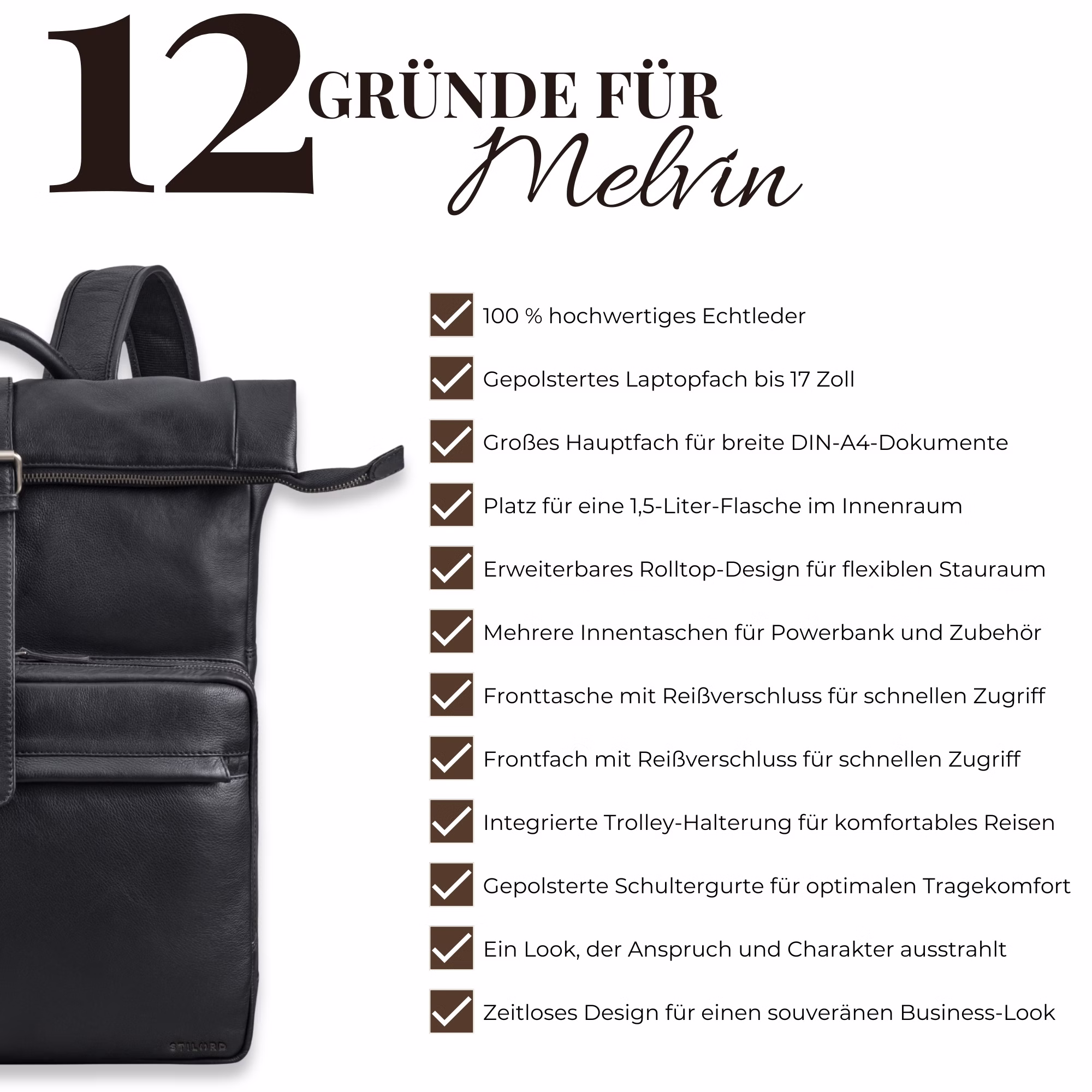 Alcuni compagni sono più che bagagli: diventano parte della tua vita. Lo zaino pelle "Melvin" per uomo offre spazio per MacBook 17", documenti DIN A4 e una bottiglia da 1,5L.