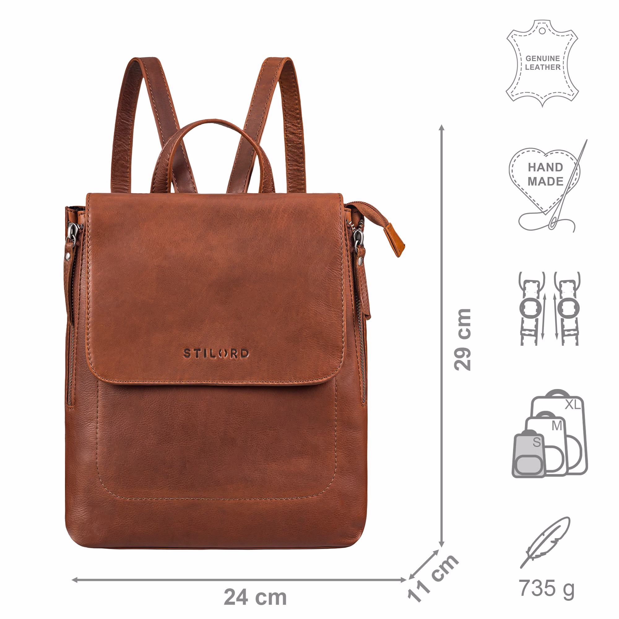- Dimensioni (LxPxA): circa 24 x 11 x 29 cm | Materiale: vera pelle bovina | Peso: 735 grammi